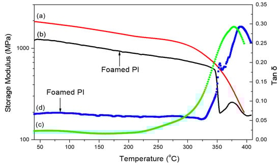 Dynamic mechanical analysis (DMA) curves for (a,c) pure PI and (b,d) porous PI (obtained from 10 wt % PEO-POSS), recorded at a heating rate of 2 °C/min [75]. Reproduced with permission from Elsevier.