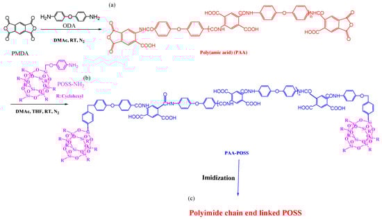 Preparation of (a) poly(amic acid) (PAA); (b) PAA/POSS nanocomposites; and (c) PI linked through its chain ends to POSS [76]. Reproduced with permission from the American Chemical Society.