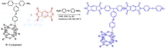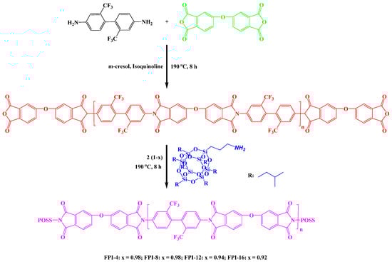 Zhao et al. [77] synthesized a series of fluorinated PI/POSS hybrid materials through a simple route from 2,2′-bis(trifluoromethyl)benzidine, 4,4′-oxydiphthalic dianhydride, and a monofunctional POSS in m-cresol and isoquinoline as solvents (Figure 7). These hybrid polymers possessed low dielectric constants (in the range 2.47–2.92), high thermal stability, film formation ability, excellent solubility, and good hydrophobic and mechanical properties.