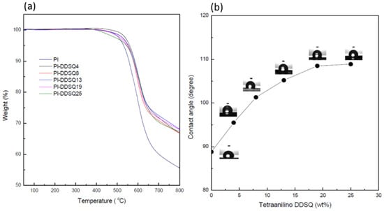(a) Thermogravimetric analysis (TGA) thermogram and (b) water contact angles of PIs containing various contents of 5,11,14,17-tetranilino DDSQ [81]. Reproduced with permission from Wiley.