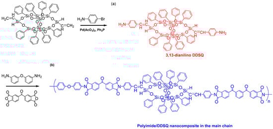 Zheng et al. [82] reported a facile synthetic method for the preparation of organic/inorganic PI with DDSQ in the main chain (Figure 12). First, a DDSQ-diamine was synthesized through a Heck reaction of 3,13-divinyloctaphenyl double-decker silsesquioxane (3,13-divinyl DDSQ) with 4-bromoaniline in the presence of a palladium catalyst; next, thermal imidization of the 3,13-dianilino DDSQ with ODA and 3,3′,4,4′-benzophenonetetracarboxylic in DMAc afforded PI/DDSQ nanocomposites.