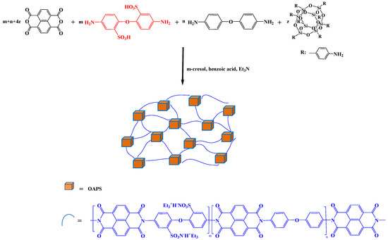 Li et al. prepared a series of octa(aminophenyl)silsesquioxane (OAPS) covalently cross-linked sulfonated PIs (SPIs) (Figure 15) [84]. These OAPS cross-linked PI membranes possessed greater chemical and thermal stability, higher strength, and excellent solution processability when compared with those of the linear sulfonated PI membrane. Moreover, when the OAPS content was 0.4 mol %, the proton conductivity of the cross-linked SPI membrane reached its highest value (0.111 S/cm).