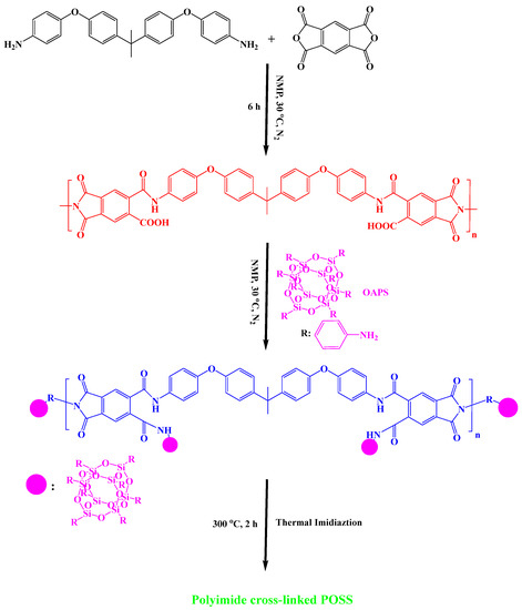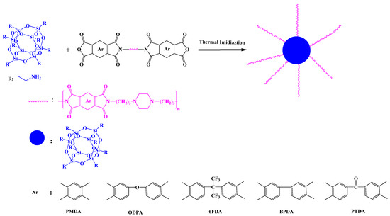 Alagar et al. synthesized PI/POSS hybrid) materials through a two-step method (Figure 16) [85]. First, the formation of PAA from bisphenol-A ether diamine (BAED) and PMDA in NMP under N2 at 30 °C, and its blending with various percentages of OAPS; subsequently, thermal imidization of the PAA/OAPS nanocomposites at 300 °C to obtain the POSS-PI nanocomposites. Thermal studies revealed that the glass transition temperature, char yield, thermal stability, and flame-retardant properties of the POSS-PI hybrid nanocomposite were all greater than those of the pristine PI. Adıguzel et al. [86] prepared star polyimides containing polyhedralsilsesquioxane as the core through in situ thermal curing of PAA with octa(aminopolyhedralsilsesquioxane) (Figure 17). The POSS-PI star nanocomposites exhibited unique characteristics including low water absorption, low dielectric constant, and good mechanical and thermal properties arising from the insertion of the rigid POSS units in the PI backbone.