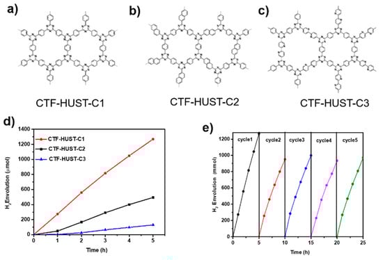 (a–c) Structure of highly crystalline CTFs obtained by the polycondensation method, (d) time course of photocatalytic hydrogen evolution and (e) recycle experiment of a CTF-HUST-C1 sample. (adapted from reference 79). Reprinted with permission from [79]. Copyright 2018, Wiley-VCH.