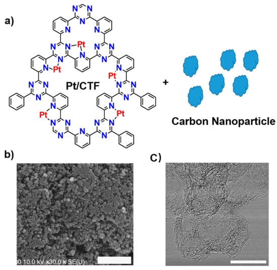 (a) Structure of Pt–CTF–CP (carbon particles), (b) SEM image and (c) TEM image of Pt–CTF–CP (Adapted from Reference 30) [30] (Copyright, Nature Publishing Group).