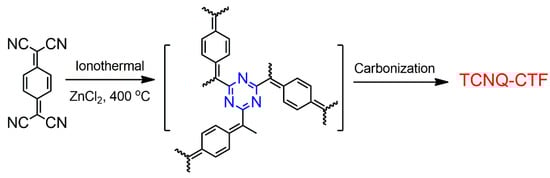 Zhi et al. studied the structural evolution of high-performance energy storage for supercapacitors in CTFs [45,85]. They selected 2D CTFs with microporous structures and investigated the correlation of nitrogen content and micropores with supercapacitance performance. It was revealed that not only the heteroatom affects the performance, but also the micropores may contribute to a high performance. Zhu et al. developed a new strategy to construct CTF-1 and graphene hybridized materials with a sandwich-type structure, which can maintain a high surface area and a two-dimensional morphology [46]. The resulting materials exhibit excellent supercapacitor performance compared to porous carbon materials. Deng et al. recently reported a series of highly porous CTFs (TCNQ–CTFs) based on 7,7,8,8-tetracyanoquinodimethane (TCNQ) building blocks (Figure 7) [58]. TCNQ–CTFs were prepared at different temperatures varying from 400 to 900 °C at ionothermal conditions. They found that TCNQ–CTF-800 provided the highest nitrogen content of 8.13% and the highest BET surface area of 3663 m2 g−1. The supercapacitance measurement showed that a high capacitance of 383 F g−1 was achieved in alkaline conditions. These results may provide principles for the future design and synthesis of materials. The importance of the heteroatom, the pore size distribution in the materials, and the choice of the building blocks need to be considered in the design of materials for supercapacitors.