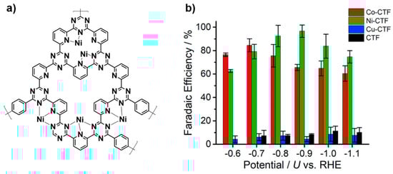 The electrocatalytic conversion of CO2 to useful chemicals or value-added chemicals is also a promising route to address environmental and energy issues. However, most materials have still low efficiencies, such as low faradaic efficiencies and large overpotentials. Recently, using CTFs in electrocatalysis to reduce CO2 has received attention. Su et al. have adopted a pyridine-containing CTF to work as ab efficient electrocatalsyt for CO2 reduction to CO (Figure 8) [91]. They introduced a pyridine unit in the CTF and provided coordination sites for various metals, i.e., Co, Ni, Cu. Then, they investigated the influence of different metal atoms on the electrocatalysis performance. It was shown that Ni–CTF gave the best performance as compared to other metals. It also showed better performance than metal-porphyin structures. They further used theoretical calculation to reveal the mechanism of the enhanced performance, and attributed it to the low coordination of the CTF structure, which gave lower free-energy barriers for the adsorption of COOH on the coordination sites [91].