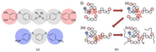 Representation of the coarse-grained model. (a) Coarse-grained mapping schemes of phthalonitrile monomer p-SiMePN and initiator (diamine curing agent 1,3-bis(4-aminophenoxy) benzene). (b) The scheme of the “mesoscale chemistry” reactions of initiation (i–ii) and polymerization (ii–iv). Terminal beads of each monomer (red) and initiator (blue) have valences of 2 and 1, respectively; asterisk indicates an active bead. Red arrows show reaction pathways.
