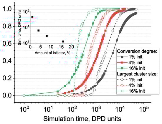 Conversion degree and fraction of particles belonging to the largest cluster as functions of the simulation time. The inset shows the simulation time required to obtain 95% conversion degree depends on the amount of the initiator.