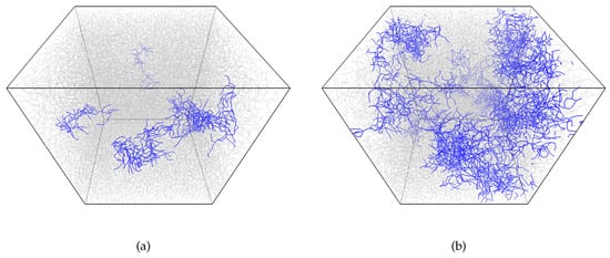 Snapshots of systems with 4% initiator (a) before (conversion degree , largest cluster size ) and (b) after (, ) gelation point. The largest clusters are marked in blue for both systems.