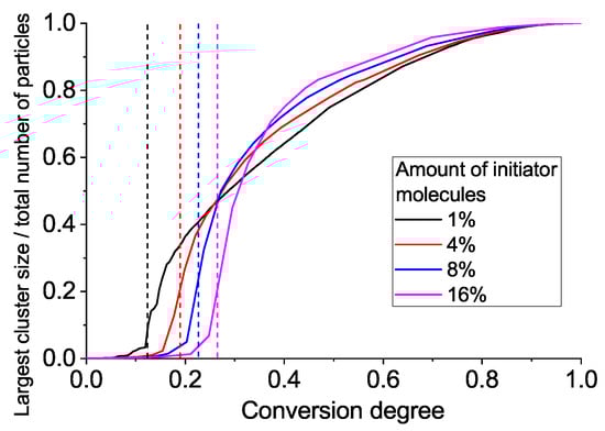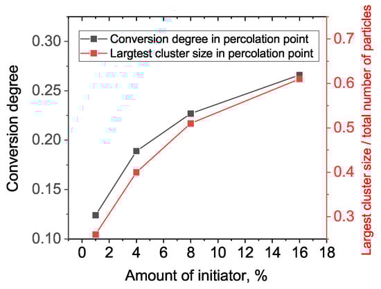Let us discuss, in more detail, the process of gelation and which properties of the network form near the sol–gel transition (i.e., percolation threshold). Figure 4 gives snapshots of the network structure below and above the gelation point, while Figure 5 gives the largest cluster size versus conversion plot. We observe a very heterogeneous network with several growing clumps crosslinked with each other upon gelation. Such heterogeneity is, of course, the consequence of each monomer unit’s valence being equal to four, which leads to the formation of a very dense crosslinking network. An interesting conclusion can be made from Figure 5: the system with a higher amount of initiator has a more delayed and sharp gelation transition (note: here, we talk in terms of conversion along the abscissa axis, not real time). This results in an increased conversion degree and the largest cluster size at gel point, as can be seen from Figure 6.