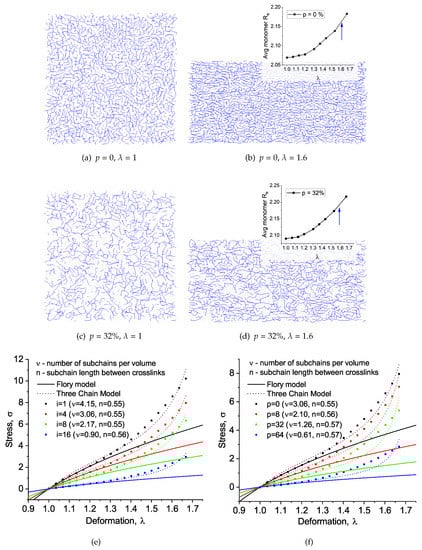 We performed network uniaxial constant volume deformations to study the system’s mechanical properties, as shown in Figure 7 (here, i and p refer to the amount of initiator and plasticizer, correspondingly). In the upper part of Figure 7, the 2D slice snapshots are presented in equilibrium and deformed state (), while, below, the stress–strain curves are shown. One can see slight alignment along the elongation axis in the deformed state. In addition, there is sufficiently great monomer stretching at (see averaged monomer end-to-end distance in insets in Figure 7). This is likely responsible for the rapid nonlinear increase in stress during high elongation, which is not predicted by the Flory model. We also note that the non-uniform direction of these fully stretched segments, especially for the system with the plasticizer, shows that the deformation of the internal network structure is non-affine.
