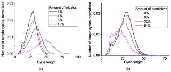 Distribution of simple cycle lengths in matrices with various amount of (a) initiator and (b) plasticizer. The number of simple cycles was normalized by dividing it by the number of particles in the polymer matrix.