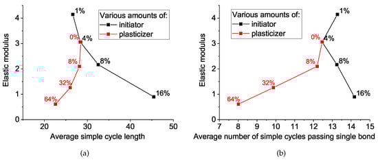Dependencies of elastic modulus of matrices with various amount of initiator and plasticizer on (a) the average simple cycle length and (b) the average number of cycles passing through a bond.