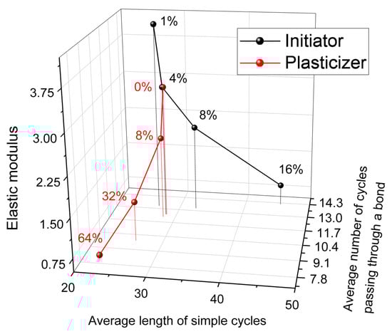 To do this, we calculated one more network property: the average number of cycles passing through the bond, which we correlated with the elastic modulus, together with the average cycle length, as seen in Figure 9. The elastic modulus decreases during the increase in initiator concentration (black curve) in straightforward accordance with the simple cycle behavior. However, the situation with the plasticizer concentration is the opposite and, at first glance, counterintuitive: the decrease in cycle length yields a decrease in the elastic modulus. The preliminary conclusion here is the following: both additives (initiator and plasticizer) affect the network properties and considerably decrease the elastic modulus, but the mechanisms are transversal. In the next session, we try to rationalize the aforementioned difference in the mechanism of network softening by the initiator and plasticizer.