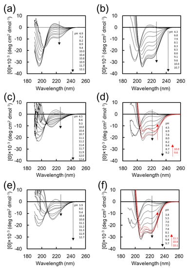 - Greenfield, N.J.; Fasman, G.D. Computed circular dichroism spectra for the evaluation of protein conformation. Biochemistry 1969, 8, 4108–4116. [Google Scholar] [CrossRef]