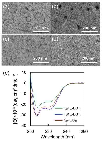 The self-assembly of K20-EG12 or K4F16-EG12 was also evaluated in a similar manner as a control. The TEM image shows that K20-EG12 formed typical core-corona type micelles with a diameter of 10 ± 4 nm (Figure 2c, Figure S3c). Although both K20-EG12 and F4K16-EG12 adopt helical structures with helix content of over 90%, as estimated from CD spectra (Figure 2e), they provided nanostructures with different morphologies. These results suggest that hydrophobicity of tetra(phenylalanine) is significant to form vesicle structures. In addition, K16F4-EG12 forms core-corona type micelles with a diameter of 16 ± 5 nm, in addition to ill-regulated aggregates (Figure 2d, Figure S3d), indicating that the position of tetra(phenylalanine) is also significant for the formation of vesicle structures.