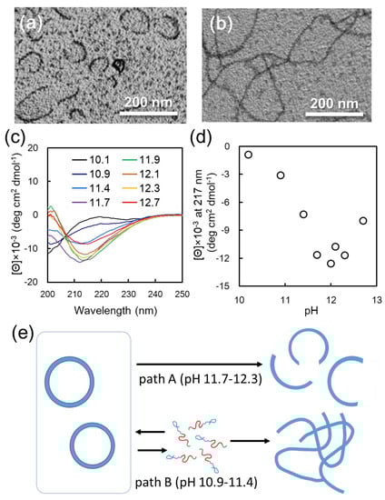 (a,b) TEM images of the nanostructures of F4K16-EG12 obtained by the dialysis of its vesicle dispersion against buffer solution at pH 12.0 (a) and at pH 10.9 (b). (c) CD spectra of F4K16-EG12 nanostructures obtained by solvent exchange at various pHs. (d) pH dependence of θ217 for the F4K16-EG12 nanostructures. (e) Schematic illustration of morphological transition of F4K16-EG12 from vesicles to arc-shaped nanostructures or long nanofibers.