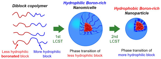Development of new boron nanocarriers has been a crucial issue to be solved for advancing boron neutron capture therapy (BNCT) as an effective radiation treatment for cancers. The present study aimed to create a novel double-thermoresponsive boron-containing diblock copolymer based on poly(N-isopropylacrylamide) [poly(NIPAAm)], which exhibits two-step phase transitions (morphological transitions) at the temperature region below human body temperature. The boronated diblock copolymer considerably concentrates boron atoms into the water-dispersible (i.e., intravenous-administration possible) nanomicelles self-assembled by the first phase transition, and furthermore the properly controlled size and hydrophobicity of the second phase-transitioned nanoparticles are expected to make a significant contribution to the selective delivery and long-term retention of boron atoms into tumor tissues. Here we present the detailed synthesis of the strategic NIPAAm-based diblock copolymer with 3-acrylamidophenylboronic acid (PBA), i.e., poly(NIPAAm-block-NIPAAm-co-PBA), through a reversible addition-fragmentation chain transfer polymerization. Furthermore, the stepwise phase transition behavior of the obtained boronic-acid diblock copolymers was characterized in detail by temperature-variable 1H and 11B-nuclear magnetic resonance spectroscopy. The phase-transition-induced molecular structural changes, including the structural compositions and sizes of nanomicelles and nanoparticles, are also discussed here.