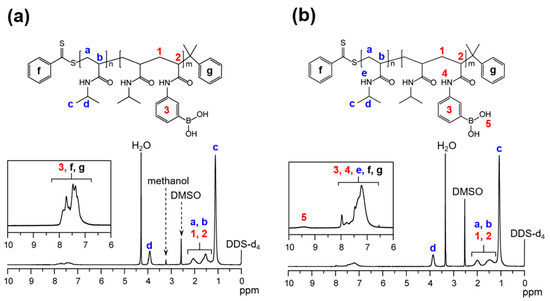 1H-nuclear magnetic resonance (NMR) spectra of (a) poly(NIPAAm-block-NIPAAm-co-PBA) in MeOD/DMSO-d6 (=1:1) solvent and (b) poly(NIPAAm-block-NIPAAm-co-PBA) in DMSO-d6 solvent at ambient temperature. DSS-d6 (concentration; 5.00 × 10−4 M) was adopted as the internal reference.