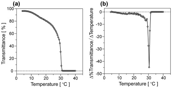 Temperature-dependent optical transmittance variation of poly(NIPAAm-block-NIPAAm-co-PBA) aqueous solutions at the concentration of 5 mg·mL−1 (a) and its differential curve (b).