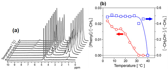 Temperature-variable 1H-NMR spectra of poly(NIPAAm-block-NIPAAm-co-PBA) in D2O from 4 to 40 °C (a) and the relative 1H-peak area intensities of the phenyl groups of boronic-acid moieties (open circle) and –CH2CH– polymer main chains (open square) against isopropyl –CH3 (b).