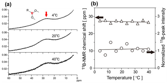 The influence of phase transition on the chemical environment and structures of boronic-acid groups of the diblock copolymers was investigated by using temperature-variable 11B-NMR measurements. Figure 6a shows some typical 11B-NMR spectra of D2O solution of poly(NIPAAm-block-NIPAAm-co-PBA) at the temperature of 4–40 °C (BF3·OEt2 was used as an external reference). The broad 11B-signal of the boronic-acid –O–B–O– groups was observed at around 27 ppm. The variation of the 11B-signal was ambiguous owing to the small amount of the polymer sample, which resulted from the lower solubility in D2O compared with DMSO-d6 and the small volume of the NMR double tube. Accordingly, the 11B-NMR spectra were analyzed by spectral-curve fitting with a Lorentzian function to determine the chemical shifts and peak area intensities. For direct comparison, furthermore, the peak area intensities calculated were normalized as a reference of the similarly calculated peak area intensity of BF3·OEt2. As shown in Figure 6b, the 11B-chemical shift and normalized signal intensity of the –O–B–O– groups were almost constant independently of the temperature variation across the first and second LCSTs. Moreover, the 11B signals definitely remained even at 40 °C beyond the second LCST, at which the 1H-NMR peaks disappeared. The results indicate that thermal-induced dehydration around the diblock copolymer leads to shrinkage of the polymer chains at each LCST, whereas the chemical structure of boronic-acid groups and their hydration environment is stable regardless of morphological transformation by the two-step phase transition.