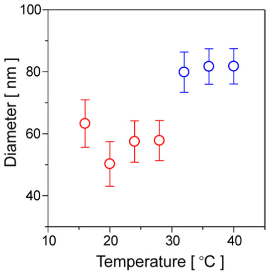 The particle sizes of nanomicelles and nanoparticles derived from the poly(NIPAAm)-based diblock copolymers by the stepwise phase transition of each polymer block at the different LCST were examined by means of DLS measurements (DelsaTM Nano HC, Beckman Coulter, Inc., Brea, CA, USA). The DLS measurements were performed using the diblock polymer solutions with enough low concentrations of 2.0 or 20 μg·mL−1 to prevent the agglomeration and precipitation of the diblock polymers at the temperature range of 16 to 28 °C or 32 to 40 °C, respectively.