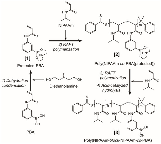 NIPAAm copolymers with PBA, poly(NIPAAm-co-PBA) was synthesized as follows. Prior to RAFT copolymerization, the boronic-acid groups of PBA were protected by diethanolamine (DEA). PBA (500 mg, 2.62 mmol) was dissolved in 50 mL of the argon (Ar)-degassed tetrahydrofuran (THF). DEA (275 mg, 2.62 mmol) was gradually added into the solution, and refluxed for 6 h at 65–68 ℃ with Ar gas bubbling. The resulting precipitates were suction-filtered and dried overnight in a vacuum at 30 °C to recover protected PBA (in Scheme 1 [1]) as white fine powders.