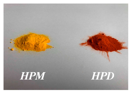 The hybrid pigments were synthesized according to the following procedure: 2 g of azo dye were dissolved in 200 cm3 of deionized water and 10 cm3 of ethyl alcohol. This mixture was then subjected to ultrasonication for 30 min. Next, the solution was heated to 80 °C, and aluminum-magnesium hydroxycarbonate (18 g) was added. The solution was stirred continuously for 3 h at 80 °C. Finally, the resultant pigment slurry was filtered and dried in an oven at 70 °C. As a result of these modifications, colorful hybrid pigment powders were obtained: LH modified with monocarboxylic dye (HPM) and LH modified with dicarboxylic dye (HPD) (Figure 2).