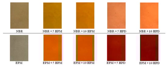 Digital photos of NBR and EPM composites containing hybrid pigments.