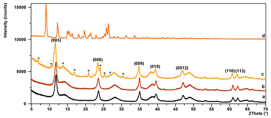 The XRD patterns of LH, HPD, and HPM are shown in Figure 4. The XRD pattern of the LH sample (Figure 4a) shows characteristic sharp and symmetrical peaks at low 2θ values, which were ascribed to diffractions by planes (003) and (006), corresponding to the basal spacing and its higher order diffractions. They are characteristic for crystalline hydrotalcite-like compounds, which form hexagonal lattices. On the slopes of the sharp peaks, small broad peaks can be observed, which may also have been due to unidentified crystalline impurities. After the addition of DCD or MCD dyes, the basal reflection (003) of the HPD and HPM pigments (Figure 4b,c) shifted slightly to a lower 2θ angle, but this did not change the interlayer distance significantly. The LH structure was retained. The most important difference observed in the diffraction patterns of HPM was the appearance of a new series of reflections that did not belong to either the LH or MCD dye. These reflections could have been caused by a new crystalline phase (marked with asterisks), which may have formed between the LH and MCD dye. The formation of the new hybrid materials was the result of interaction between the acidic groups of the dyes and ions present in the LH matrix, as will be discussed in the context of TG studies. The metal-azo dye interactions in such systems were already confirmed by time-of-flight secondary ion mass spectrometry (TOF-SIMS) analysis in our previous work [34]. The variation in the diffraction patterns of HPD and HPM dye was most likely related to differences in the structures of the azo chromophores. The modification of LH with MCD dye contributed to a greater formation of new crystals, probably due to the more complex structure of pyrazolone-azo dye in comparison to DCD.