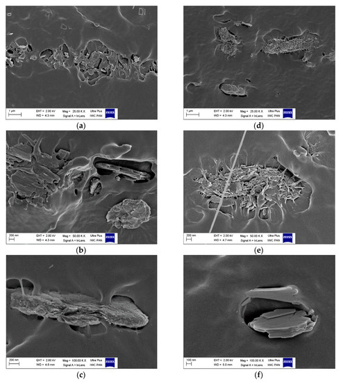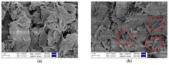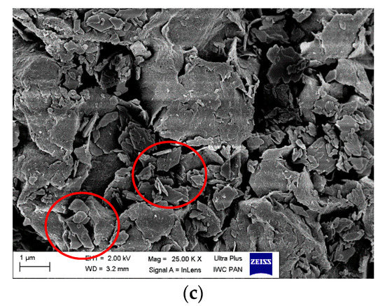 Morphological evaluation of the elastomer composites was carried out using scanning electron microscopy. Figure 14 shows SEM images of the fracture surface of NBR- and EPM-filled composites, respectively. As can be seen, the hybrid pigments after incorporation into NBR and EPM blends were still characterized by a layered structure of platelet-like shapes. They also exhibited satisfactory adhesion to the elastomer matrices. However, some small agglomerates were noticed, forming longitudinal paths or labyrinths in the composites (see Figure 14a). As can also be observed, some non-uniform distribution of the hybrid pigment particles appeared and may have affected the mechanical properties of the elastomer composites. The irregular dispersion of the LH-type pigments in the elastomer matrix may have been due to a few crucial factors, including high molecular weight, high viscosity, or the organic-inorganic incompatibility factor of these materials [16].