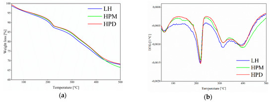 The modification of aluminum-magnesium hydroxycarbonate with azo chromophores resulted in hybrid pigments with different levels of thermal stability. Thermogravimetric differential analysis (TG-DTG) of the LH, HPM, and HPD revealed three weight-loss stages, as the temperature increased from 25 to 500 °C (Figure 6a,b). The first and second drops in weight between 25 and 250 °C could be ascribed to the removal of water molecules that had been absorbed into the surface and the interlayer space. The third weight loss between 300 and 500 °C corresponded with the dehydration of hydroxyl groups in the aluminum-magnesium hydroxycarbonate structure, as well as with the removal of carbonate anions (decarbonation) [35]. The TG results showed that the 5% weight loss temperatures for HPM (127 °C) and HPD (129 °C) were slightly shifted to higher temperatures than was the case with unmodified LH (119 °C). A similar effect was observed after dye modification in our previous work [36], in which we increased dye insolubility through the interaction of acidic groups of alizarin with particular ions present in aluminum-magnesium hydroxycarbonate (Al3+, Mg2+). The alizarin pigments demonstrated considerably lower weight loss above 300 °C, which was ascribed to the liberation of hydroxyl groups and carbonate ions from the layered mineral compared to unmodified LH. It was suggested that carbonate ions from the weak carbonate acid and water molecules were removed from the edge of the LH interlayer by acidic alizarin structures. The mechanism by which alizarin pigments were formed was similar to that for lake pigments, which are traditionally obtained by the reaction of dye molecules with metal salts [37]. A similar mechanism of metal-dye interaction is also suggested in the current study. It was concluded that slight changes in the thermal stability of the hybrid pigments were the result of interactions between magnesium or aluminum ions present in the inorganic carrier and carboxylic groups (–COO−) present in the dye molecules.