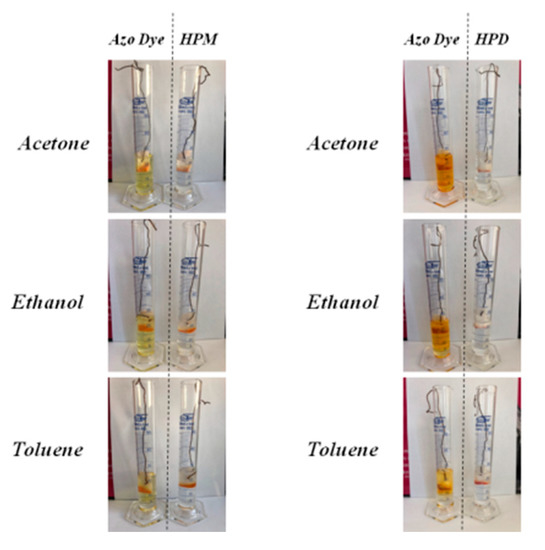 The uses of dyes are often limited due to their high solubility and tendency to migrate. One of the ways to overcome this disadvantage is the transformation of organic dyes into pigments, which are known for their insolubility and ability to create stable fine-grained dispersions in most applied mediums. The resistance of the organic-inorganic pigments and pure dye to discoloration was investigated by immersing studied powders in different solvents (Figure 7). The powder samples were placed in three different solvents (acetone, ethanol, and toluene), and the degree of discoloration was estimated after 24 h. Interestingly, the organic-inorganic pigments exhibited very strong resistance to dissolution in selected media (Figure 7). The obtained results could be attributed to the effective stabilization of dye molecules onto the LH surface. For both HPM and HPD samples, all of the solvents remained colorless, while unreacted chromophores demonstrated very intense color after 24 h of immersion. This indicated the successful modification of LH and transformation of azo chromophores into chemically stable hybrid pigments.