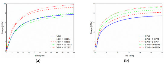 Curing curves for (a) NBR and (b) EPM compounds filled with hybrid pigments.