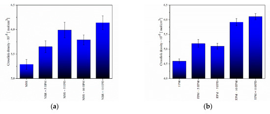 Crosslink density of (a) NBR and (b) EPM compounds filled with hybrid pigments.