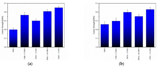 Tensile strength of (a) NBR and (b) EPM compounds filled with hybrid pigments.