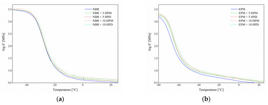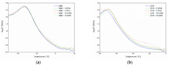 Dynamic mechanical analysis was performed to investigate alterations in the molecular mobility of the polymer segments in the vicinity of the hybrid pigments. Figure 11 and Figure 12 show the variations in the storage (E′) and loss (E″) modulus for the studied elastomer composites. It can be noticed that the incorporation of HPM and HPD resulted in an increase in the storage and loss modulus of the NBR and EPM composites. However, the peroxide curing system (EPM compounds) was observed to have had a more significant influence on the modulus values. This improvement in the modulus could be attributed to the restricted flexibility of EPM molecular chains, due to strong interactions between the polymer chain and the pigment particles. The increased stiffness, resulting from enhanced crosslink density, may also have contributed to improve the mechanical properties of the EPM composites.
