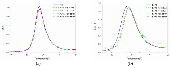 Figure 13 presents the tan δ versus temperature curves for the investigated composites. The tan δ peak is related to the polymer glass transition temperature (Tg). In the glass transition region, the energy dissipation originates mainly from the segmental motion of the macromolecular chain of the rubber matrix [42]. Interestingly, the height of the tan δ peak was gradually reduced with increasing pigment loading in both the NBR and EPM matrixes, most probably due to the restricted mobility of the rubber chains. However, for EPM composites, the glass transition temperature values were noticed to shift about 2.0 °C toward higher temperatures with the addition of hybrid pigments, while for NBR no visible changes were observed. Since the Tg shift was not dependent on the pigment type and concentration, we suggest that the main reason for this effect may have been the nature of the curing system. It was already reported [43] that a sulfur-based curing system shows a tendency for adsorption onto the outer surfaces of the fillers. A similar behavior of curing additives in NBR composites was considered in the current study. Therefore, it seems that the slight increase in Tg of the EPM/hybrid pigments could be ascribed to better immobilization of the polymer and the physical blocking of molecular configurations as a result of the more effective polymer adsorption onto the filler surface.