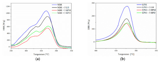 Heat release rate (HRR) curves of (a) NBR and (b) EPM composites, with a heating rate of 1 K/s.