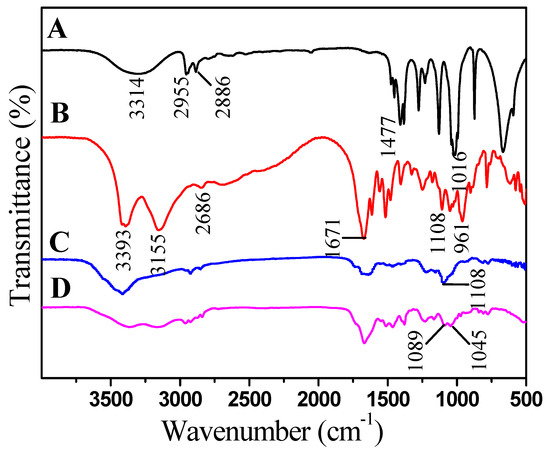 FTIR spectra of (A) PER, (B) MP, (C) compound MP/PER/PP, and (D) reactive MP/PER/PP masterbatches.