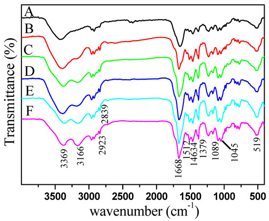 FTIR spectra of reactive extruded MP/PER masterbatches with different molar ratio: (A) MP/PER = 1.0; (B) MP/PER = 1.2; (C) MP/PER = 1.4; (D) MP/PER = 1.6; (E) MP/PER = 1.8; (F) MP/PER = 2.0.