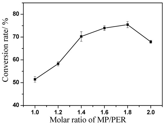 The conversion rate of the reaction between MP and PER are calculated and the results are presented in Figure 3. It is also found that the conversion rate increases when the MP/PER molar ratio varies from 1.0 to 1.8, and then decreases. The highest conversion rate of 75.45% is obtained when the molar ratio reaches 1.8, which further confirms the FTIR results. The structures of the reaction products depend on the ratios of reactants. When the MP/PER molar ratio is greater than or equals 2.0, the hydroxyl groups of PER can be consumed completely and a product without hydroxyl groups will be produced. While the MP/PER molar ratio is less than or equals 1.0, the hydroxyl groups of PER cannot be consumed completely and a product with hydroxyl groups will be formed [21].