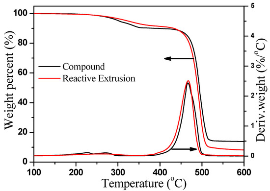 Figure 6 shows TGA and DTG curves of reactive extruded and compound EPDM/PP/IFR composites with 25 wt % content of IFR (MP/PER = 1.8). The thermal stability of the compound sample is lower than the reactive one at low temperature (250–350 °C), however, the curve of the reactive sample shifts to low temperature at high temperature (near 500 °C). The charred residue of the compound sample is also higher than that of reactive one. The values of T5% and Tmax of the compound sample are 302.6 and 493.0 °C, respectively. But the TGA results in high temperature mean that a better thermal stability is obtained for the compound sample. It is inferred from TGA that the gas flow of high purity grade nitrogen isolates the oxygen, which leads a different thermal degradation during the combustion process in atmosphere. The high char residues for compound samples are mainly caused by the carbonization of PER and polymer matrix. This will be further analyzed in the following chapter.