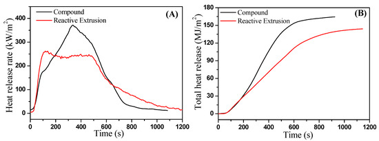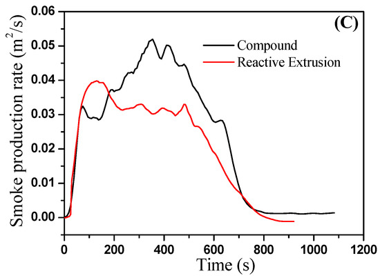 The CCT is an advanced calorimetry instrument based on oxygen consumption theory in the field of fire science [27]. It is very effective to evaluate the combustion performances of materials, which provides an important reference in terms of material design, evaluation and fire prevention [28,29]. The curves of heat release rate (HRR), total heat release (THR), and smoke production rate (SPR) for EPDM/PP composites with the compound and reactive IFR are shown in Figure 7, and the detailed data are listed in Table 4. The materials will be at serious fire risk if the peak value of HRR is reasonably high [30]. In Figure 7A, a much lower and smooth HRR curve is observed in a reactive extruded sample, and the THR value is also lower than compound one as shown in Figure 7B. What’s more, the time to ignite (TTI) of reactive sample is longer than that of compound one, as listed in Table 4. In the SPR curves of Figure 7C, in the early stage of combustion (0–200 s), the reactive sample reaches a high smoke production, however, the SPR of the compound one becomes much higher than the reactive one in the following stage (200–700 s). The high smoke production rate is also related to the high fire risk.