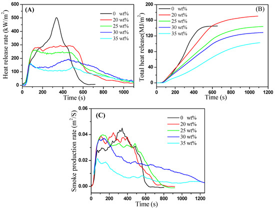 Figure 8 and Table 5 exhibit the effect of different contents of reactive MP/PER IFR on the dynamic flammability of EPDM/PP, and the photos of char residues after CCT are shown in Figure 9. For EPDM/PP, one single high peak of HRR is observed in Figure 8A. With the addition of MP/PER, two low peaks are emerged, and the peak values become much lower and smoother with the increasing content of IFR. The TTI values of the samples also increase when the IFR content is increased. In Figure 8B, the THR value of the sample with 20 wt % IFR is even higher than EPDM/PP after 600 s. Although the IFR can promote the formation of char layers which play a protective role for polymeric matrix, the heat release of “second burning” will still occur if the char layers are insufficient and dispersed [31]. The THR values exhibit a remarkable decrease when the IFR content reaches 30 wt %, and the SPR values also decrease obviously when the IFR content reaches 35 wt %, as shown in Figure 8C. The char layers are thick and dense enough to prevent the volatilization of micro-molecules. It is also concluded that the flame retardancy of EPDM/PP/IFR composites is tremendously improved when the contents of reactive MP/PER are over 30 wt %. This has been also verified by the results of UL-94 level and LOI values. In addition, the photos of charred residues in Figure 9B,D show that the composites with reactive MP/PER masterbatches have more stable and dense char layers, and the char residues in compound sample are fragile and splintered.