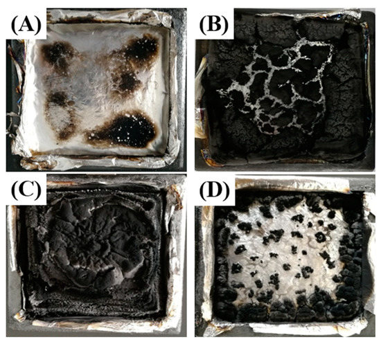 Photographs of residue chars of (A) EPDM/PP; (B) EPDM/PP/25% reactive IFR; (C) EPDM/PP/35% reactive IFR; (D) EPDM/PP/25% compound IFR.