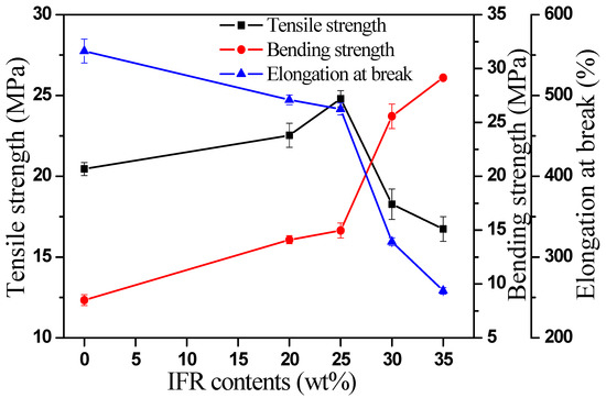 The variation of mechanical properties is an important indicator for the applications of polymer composites. The tensile strength, bending strength, and elongation at break of EPDM/PP/IFR composites with different contents of reactive MP/PER IFR are shown in Figure 10. It can be seen from Figure 10 that the bending strength of the samples with higher contents of IFR increases significantly, which indicates that the stiffness and rigidity of composites are enhanced. The tensile strength shows an increasing trend and elongation at break decreases slightly when the IFR content is lower than 30 wt %. When it gets higher than 30 wt %, an obvious decrease in tensile strength and elongation at break is clearly observed. The variations in the mechanical parameters indicate the embrittlement has occurred. The effects of the inert IFR particles on mechanical properties are mainly attributed to the particle size and dispersion in the polymer matrix. When the content of IFR is high enough, the gathering of the particles makes them become hard spots. In loading process, these hard spots will cause the stress concentration, crack and lead to a failure of materials and mechanical performances deterioration [32].