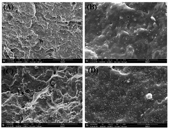The data of mechanical properties listed in Table 6 show that reactive sample has a higher tensile strength and elongation at break than compound one. This means that the reactive IFR can keep a higher retention rate of mechanical properties due to the lesser size of particles and better dispersibility after reactive extruding. The surface morphologies of the samples are exhibited in the SEM photos of Figure 11. Some gathered particles and pits sized from several micrometers to a dozen are observed in Figure 11A,B for the compound sample. For the reactive sample, although there are a few gathered particles, many more particles smaller than 1 μm can be observed during dispersion, as shown in Figure 11C,D. By the means of the reactive extruding at higher temperature, the particles of MP, PER and generated MPP can become smaller and disperse more uniformly to obtain high mechanical properties.